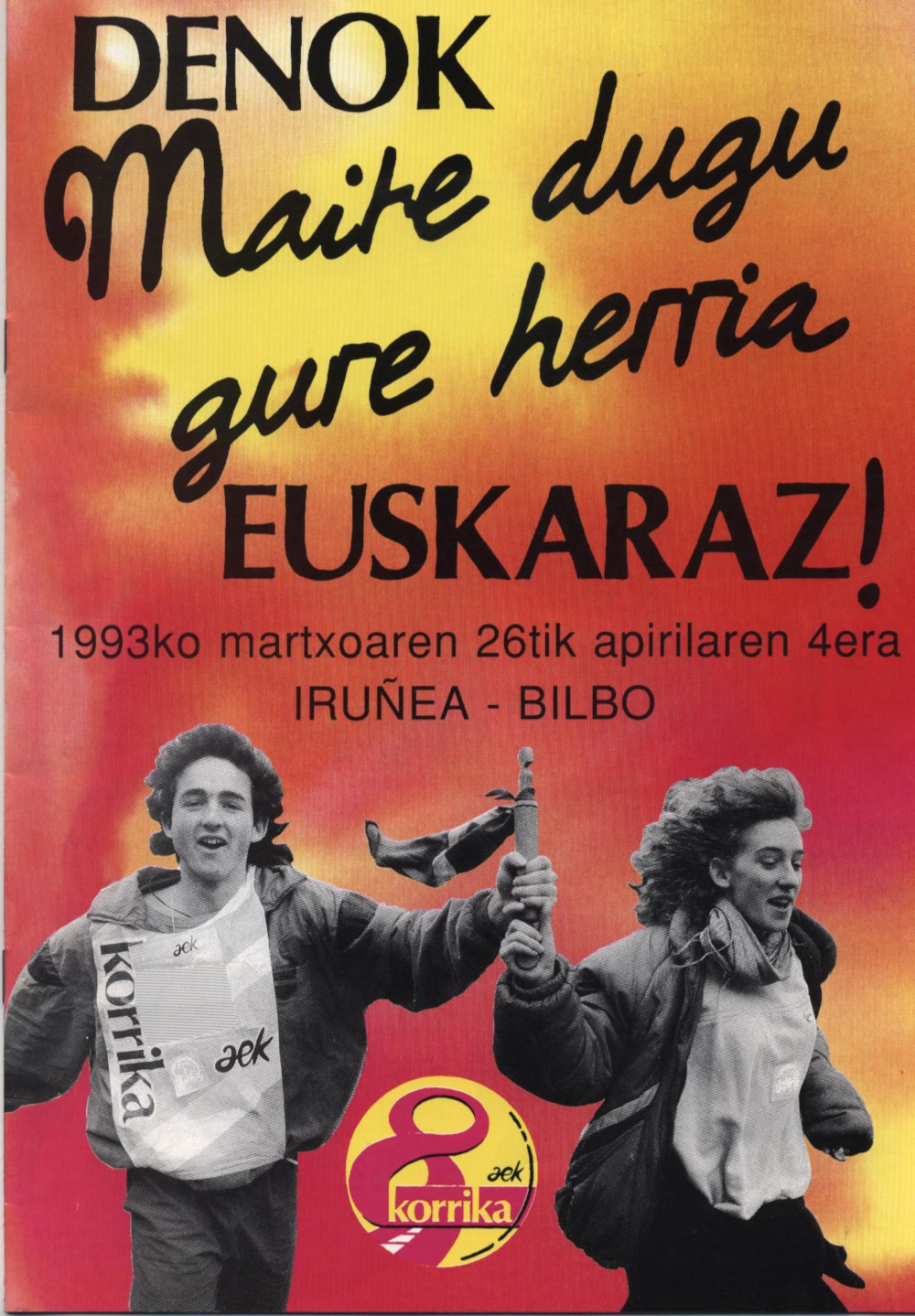 Korrikaren 8. edizioa 1993ko martxoaren 26an hasi zen Iruñean, eta, 2.120 km egin ostean, apirilaren 4an bukatu zen Bilbon, “Denok maite dugu gure herria euskaraz” lelopean; Joxemi Zumalabe izan zen mezuaren egilea. Omendua, ostera, Martin Ugalde kazetari eta idazle andoaindarra izan zen; hala,