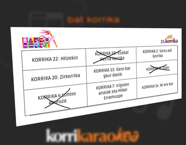 Bana itzazue txartelak zuen artean eta entzun itzazue KORRIKAko kantak ausaz. Kantak identifikatu ahala markatu itzazue zuen txarteletan.